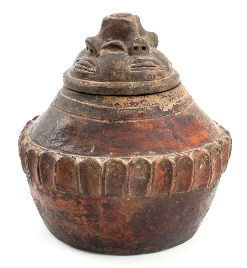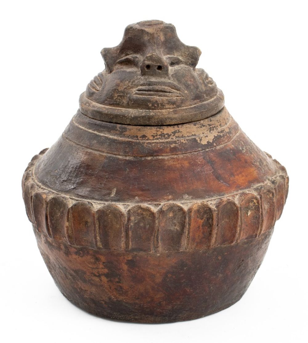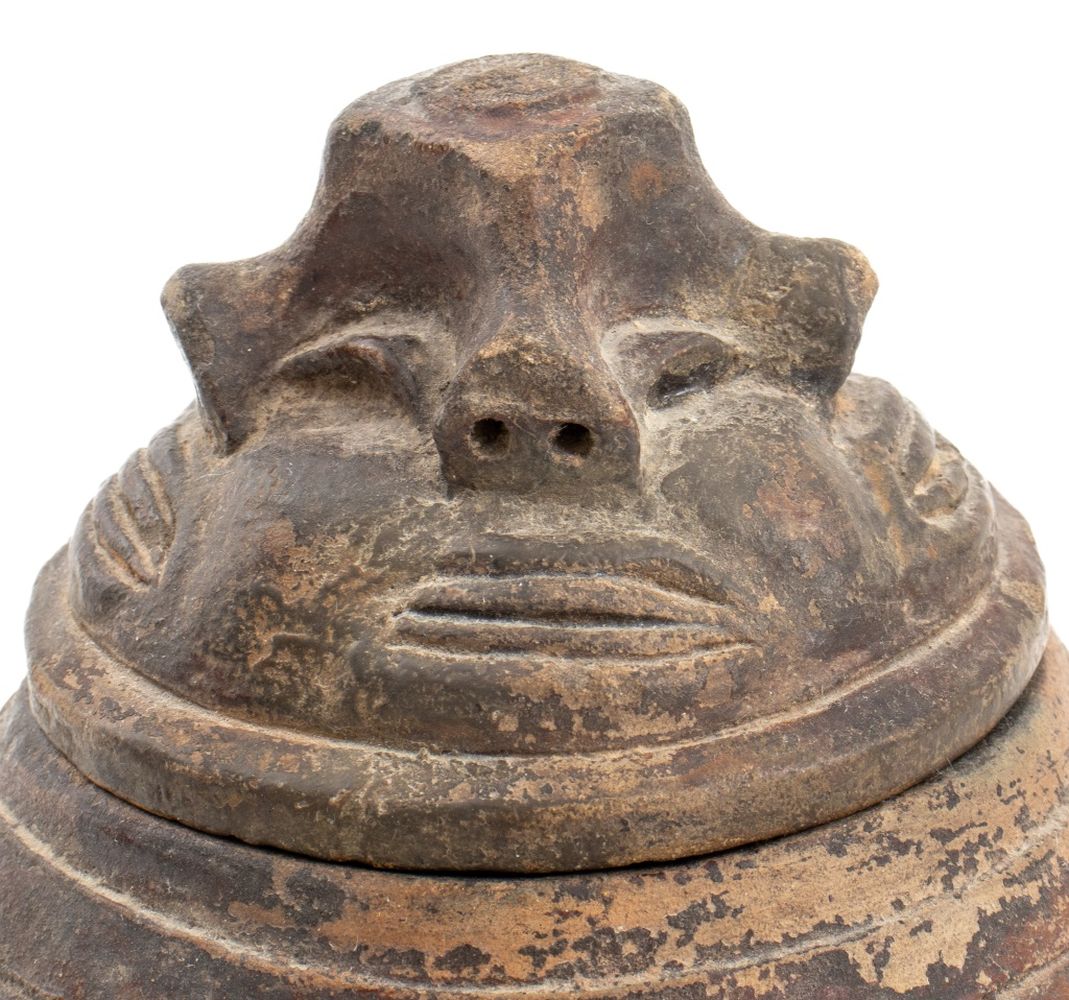 Southeast Asian Anthropomorphic Lidded Vessel, lid composed of four interlocking faces. 7.5" H x 7.5" Diameter. Provenance: From an East 81st Street Estate. Keywords: Pottery, Antique, Artifact, Antiquities, Pot, Jar, Urn, Curio cabinet accessories, Decorative Arts