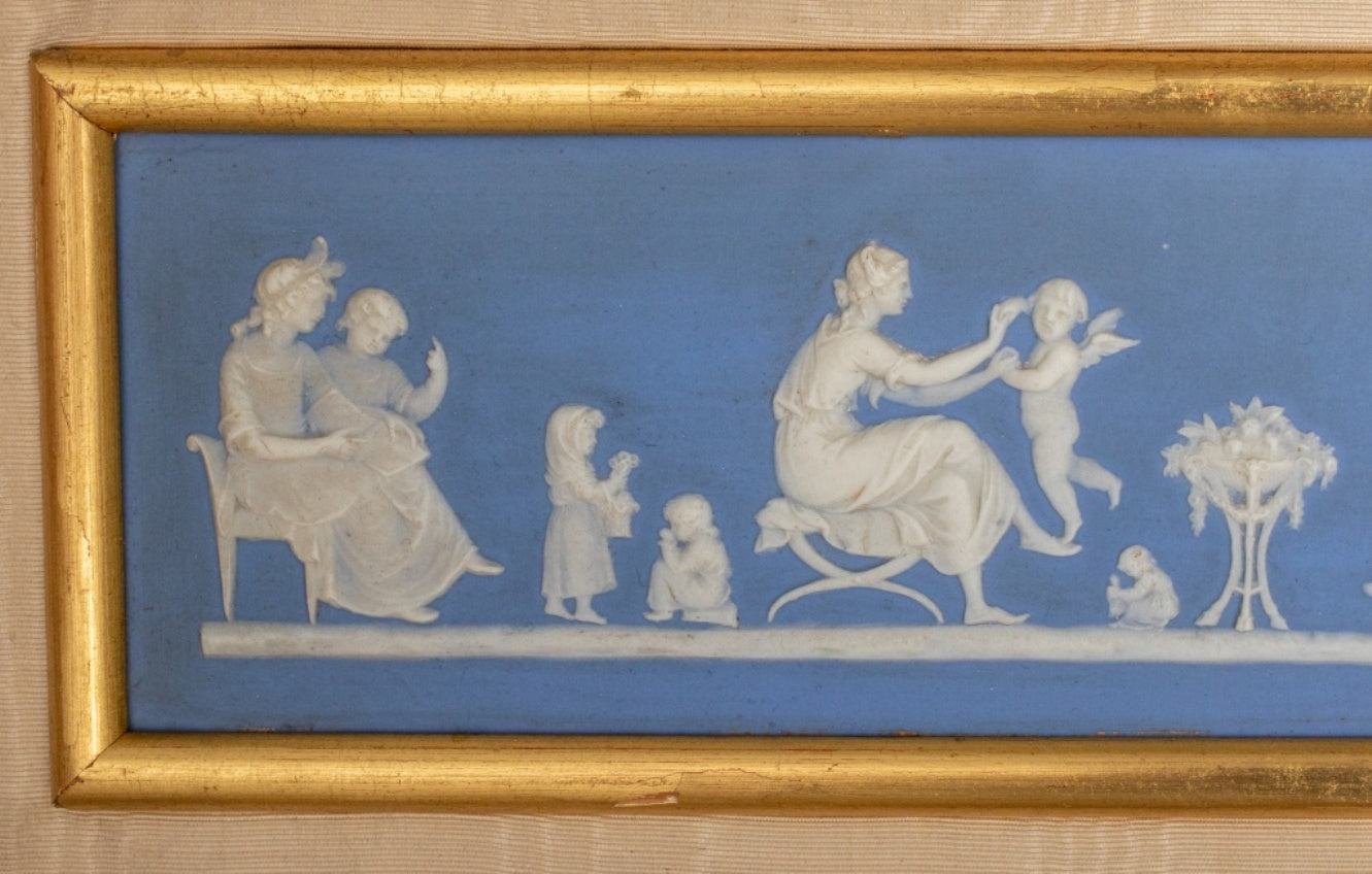 Wedgwood blue dip jasperware bas relief panel, likely late 19th century, and depicting classical women and children at study, rest, and play, now housed in a gilt and ebonized frame on sand moire ground.